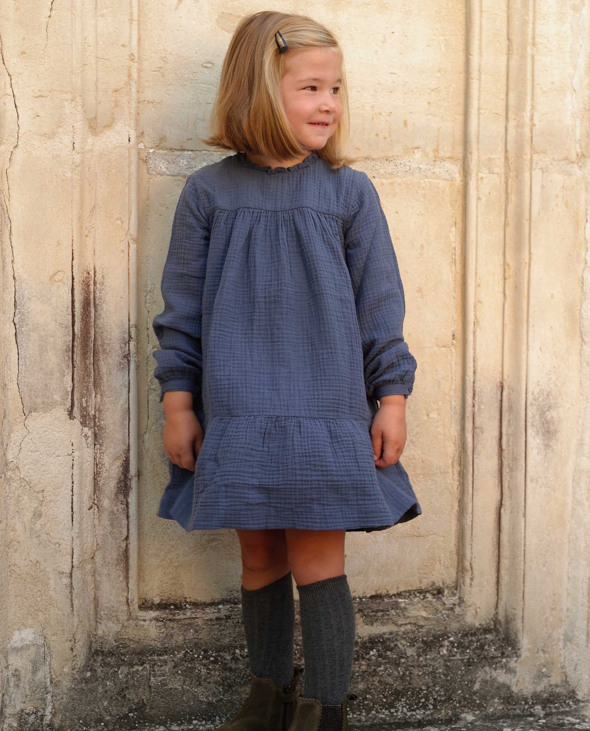 Robe en double gaze de coton. Manches longues élastiquées. Encolure ronde avec petit volant. Boutonnage dos