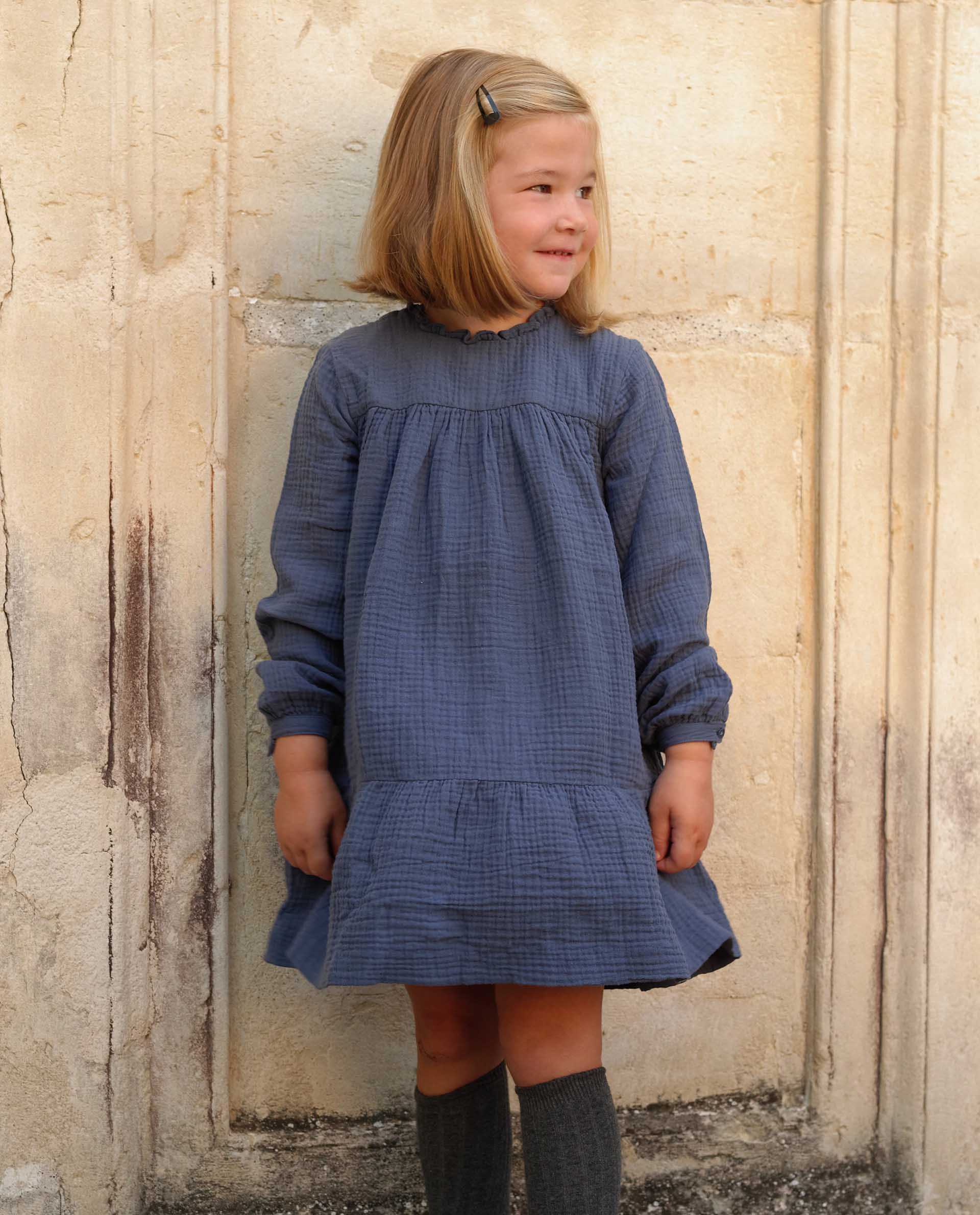 Robe en double gaze de coton. Manches longues élastiquées. Encolure ronde avec petit volant. Boutonnage dos