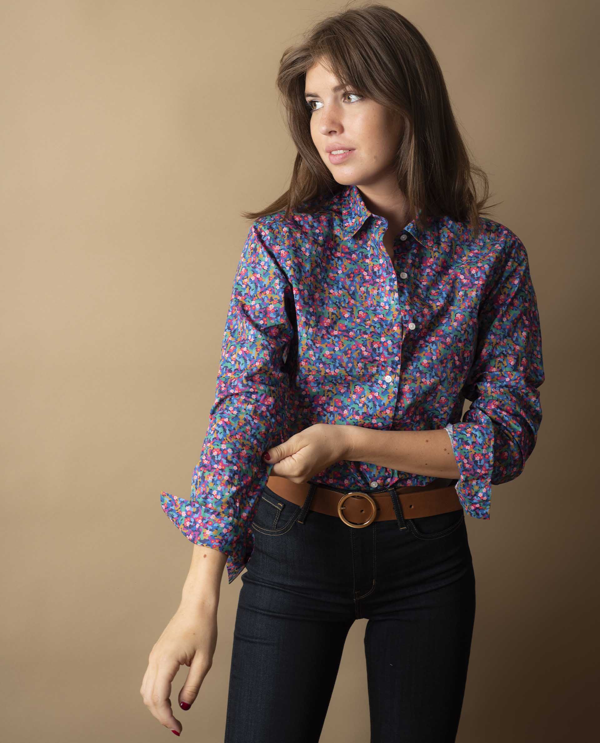 Chemisier classique, manches longues, en tissu Liberty. Deux plis plats au dos