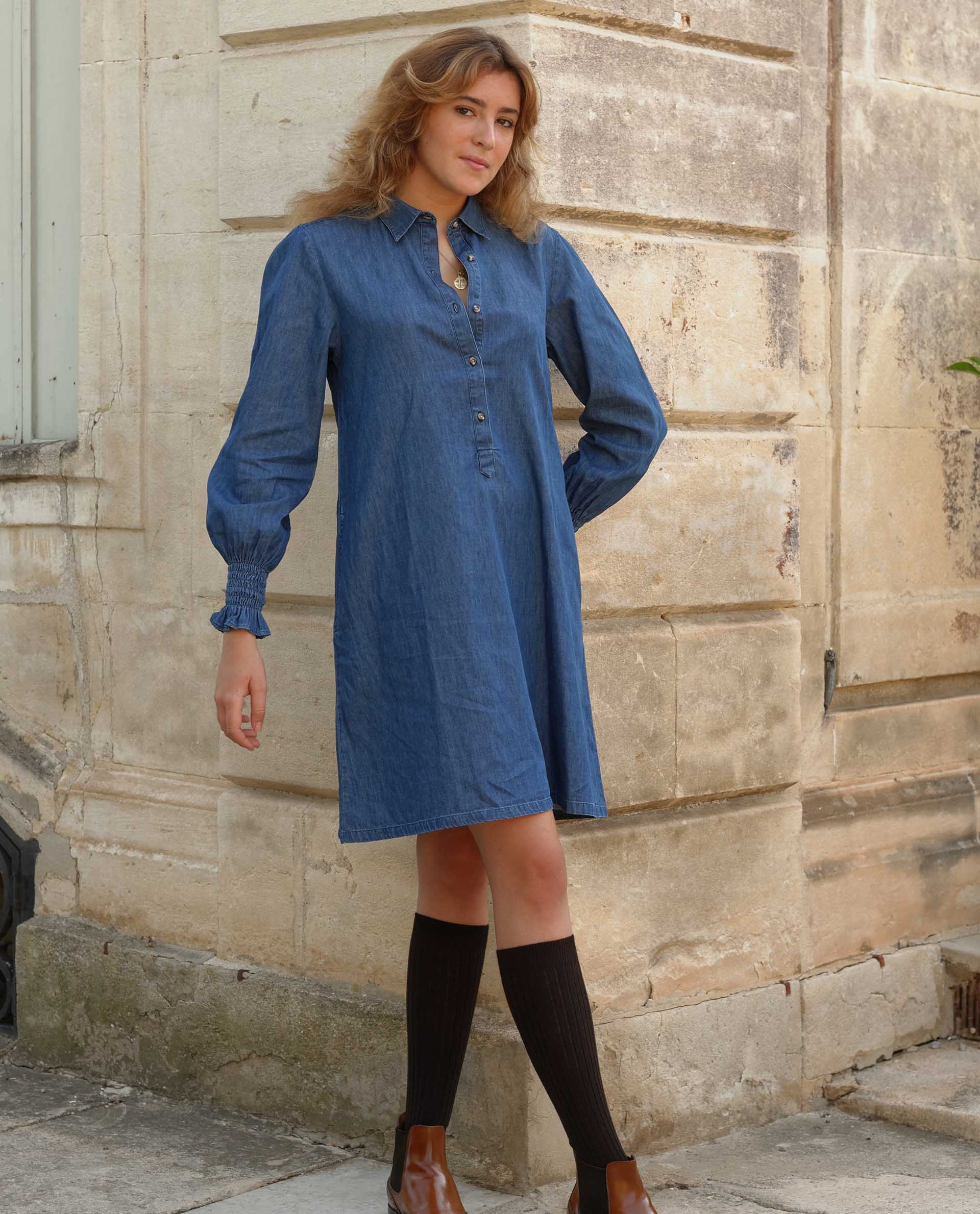 Robe évasée en coton denim, pli creux dos.Manches longues smockées avec volant