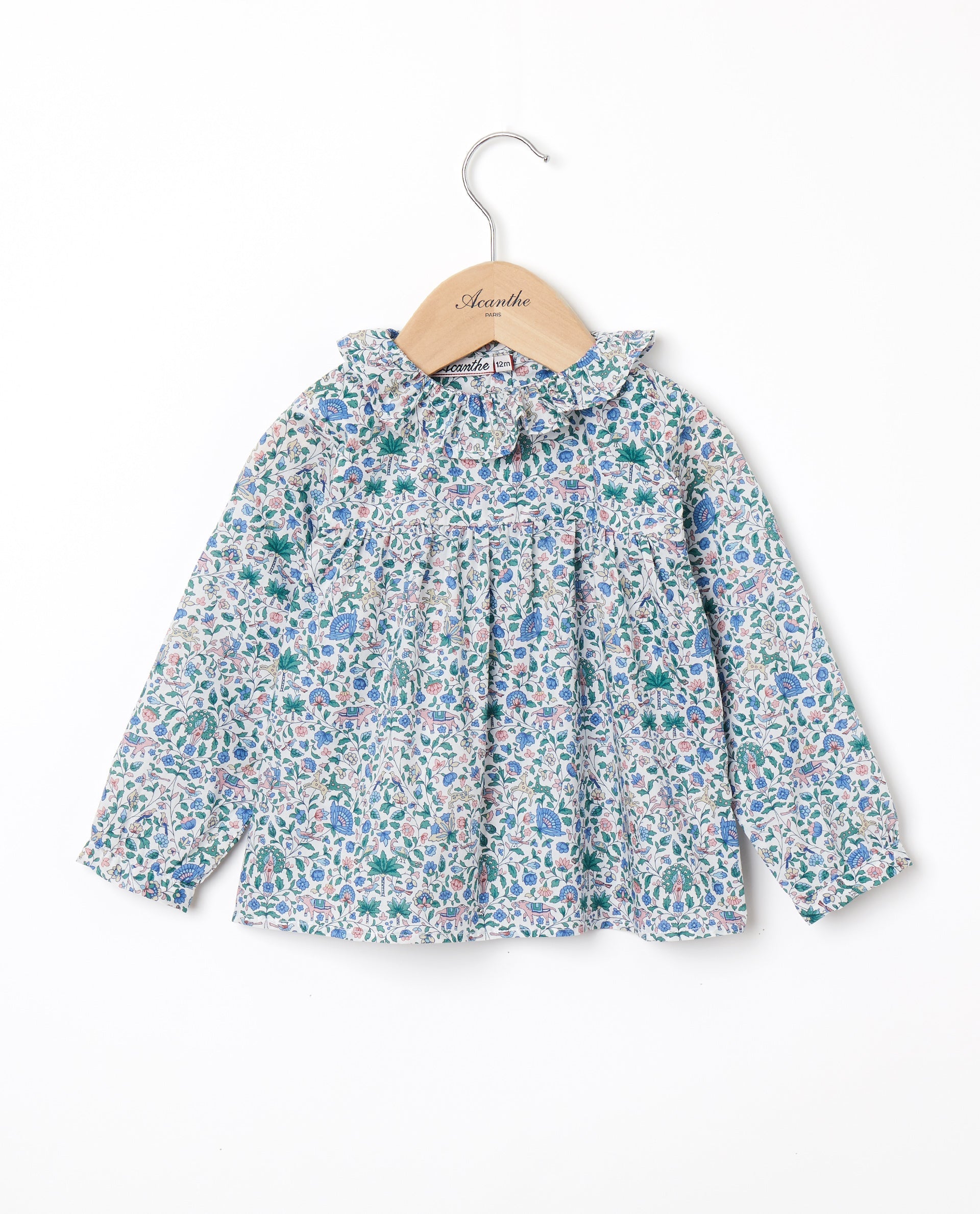 Blouse en coton Liberty. Volant à l'encolure. Manches longues. Boutonnage au dos
