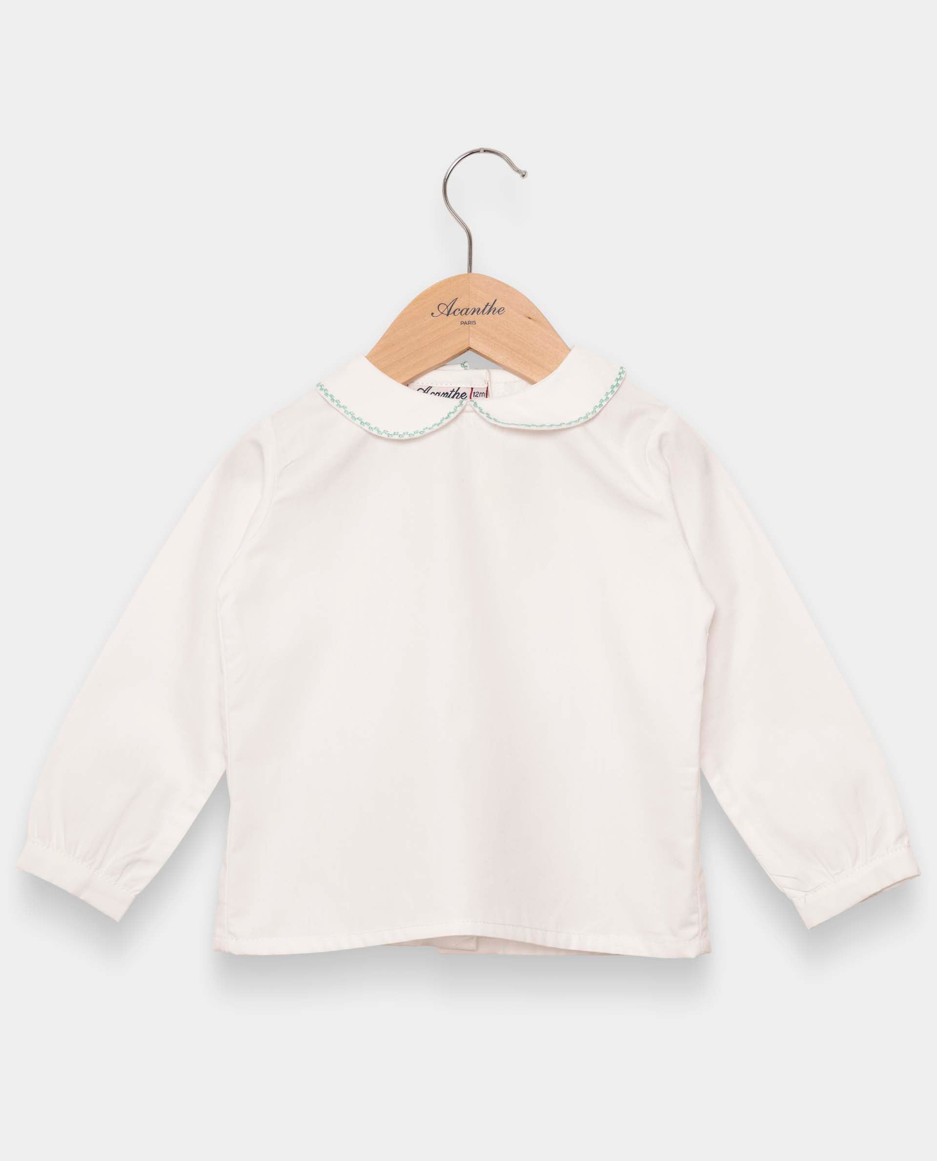 Chemisier en popeline de coton. Manches longues resserrées par un bracelet boutonné. Finition liseré vert au col. Boutonnage milieu dos