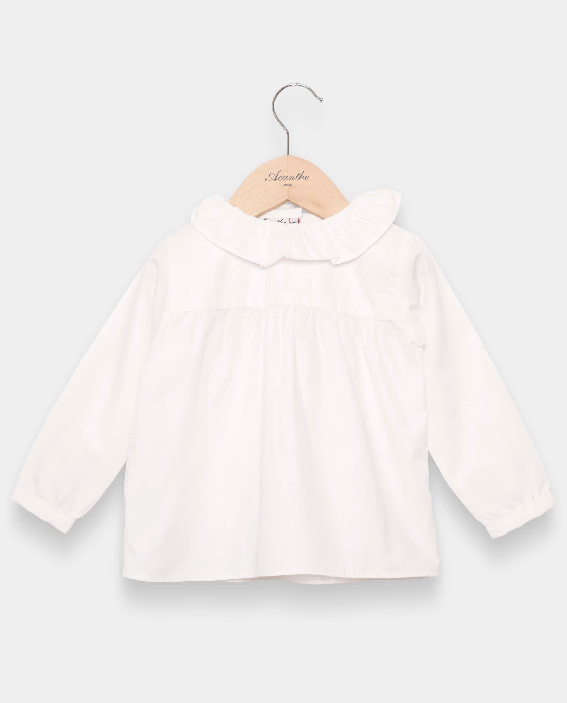 Blouse en popeline de coton. Manches longues resserrées par un bracelet boutonné. Boutonnage milieu dos. Col volanté