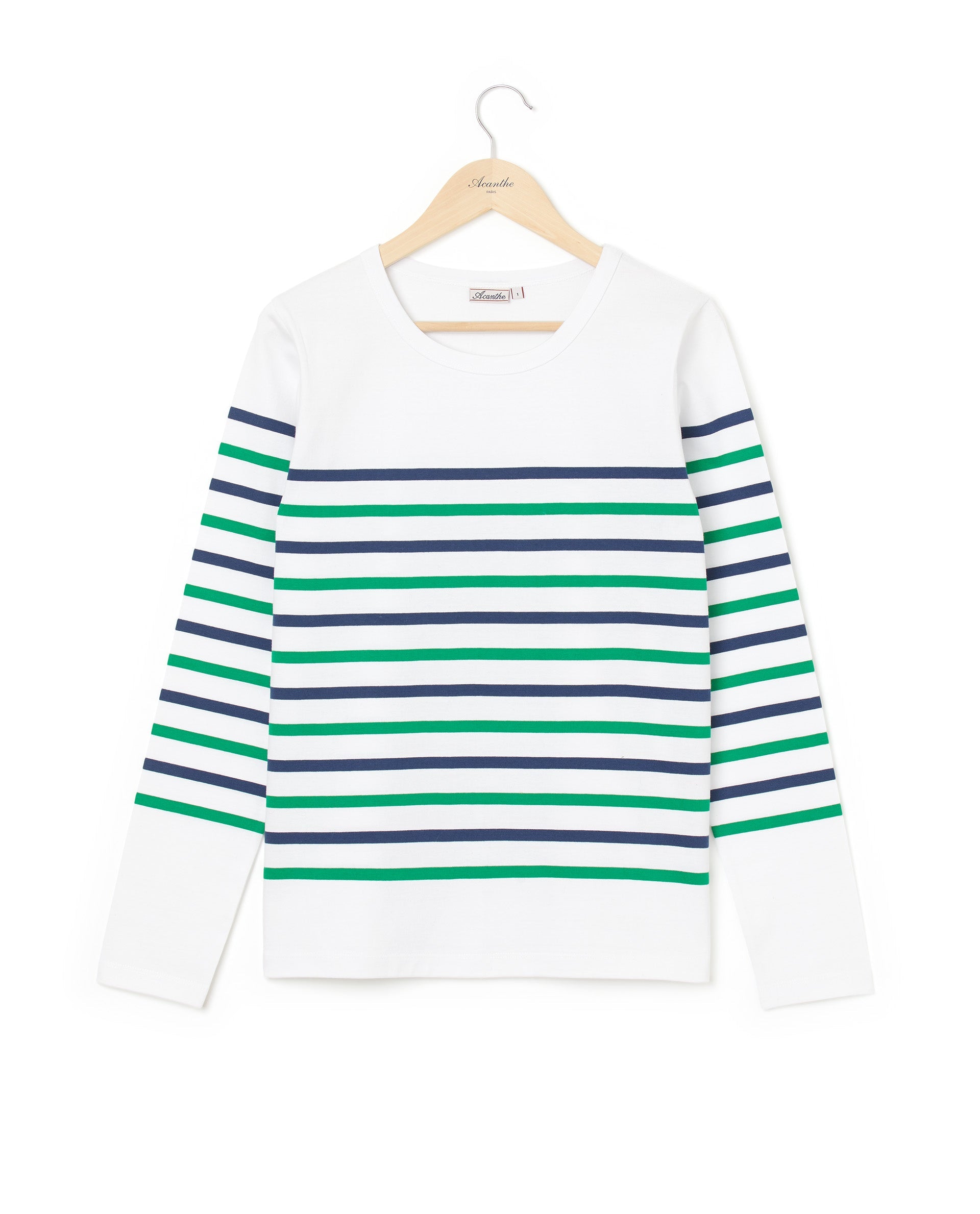 Marinière en jersey de coton. Rayures contrastées marine et vert. Le mannequin mesure 1m79 et porte une taille 2.