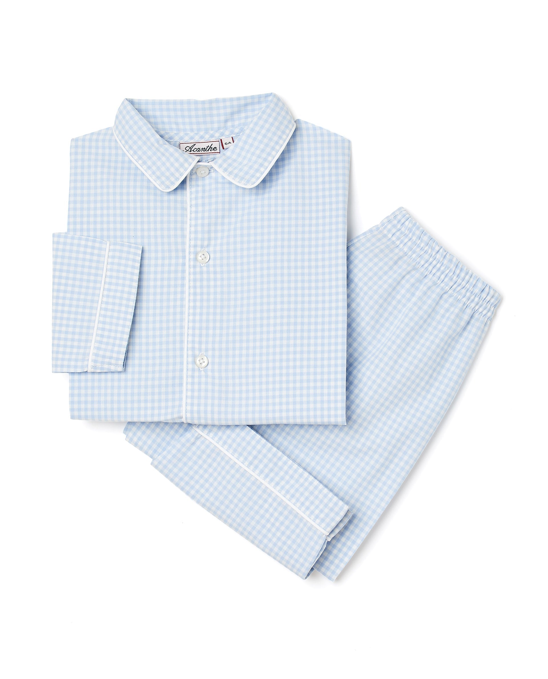 Pyjama garçon classique. Veste boutonnée devant, col pointu, manches courtes et 2 poches plaquées. Pantalon à taille élastiquée. Finitions passepoil.