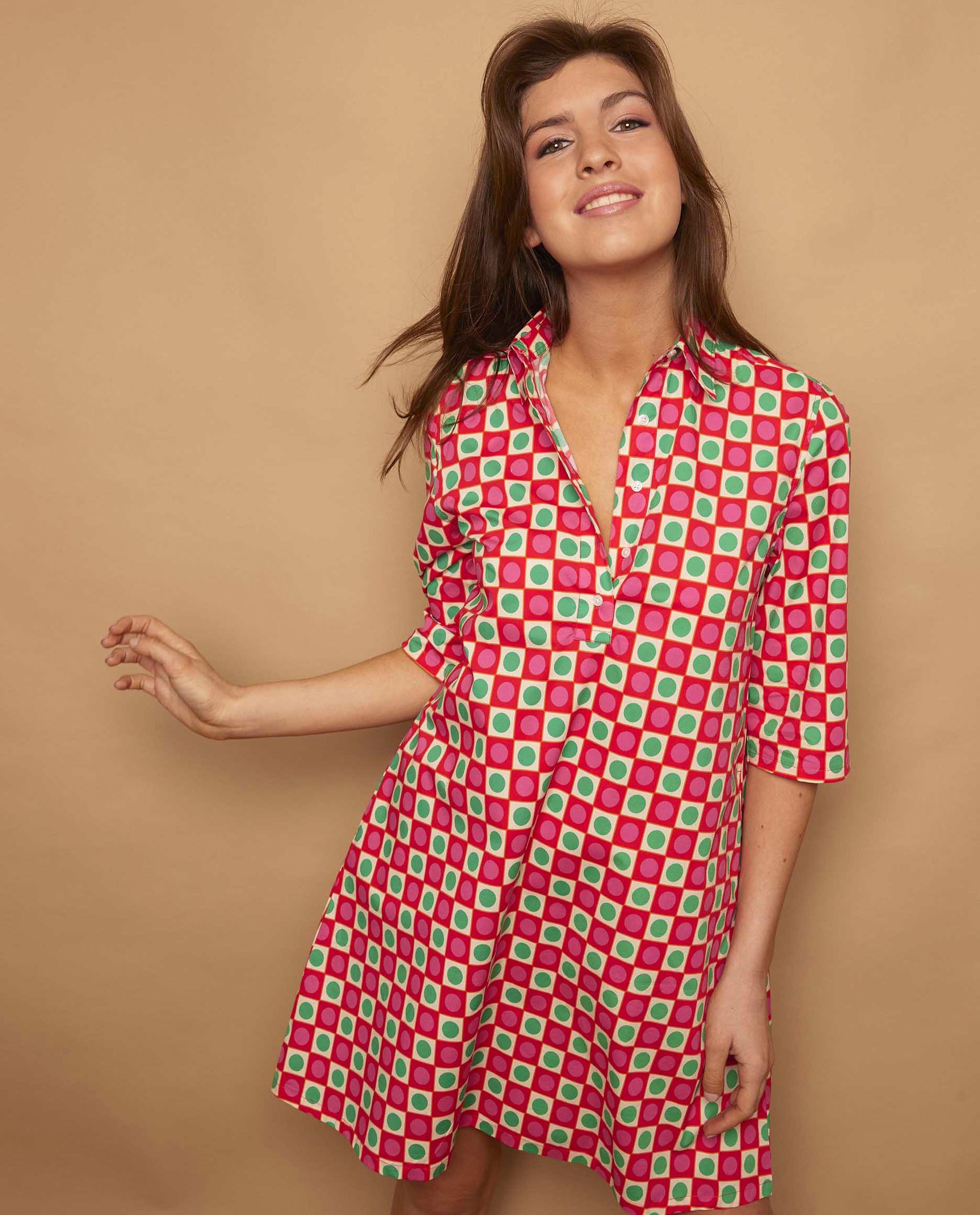 Robe évasée avec manches longueur coudes et large pli creux au dos. Deux poches côté. Le mannequin mesure 1m79 et porte une taille 1.