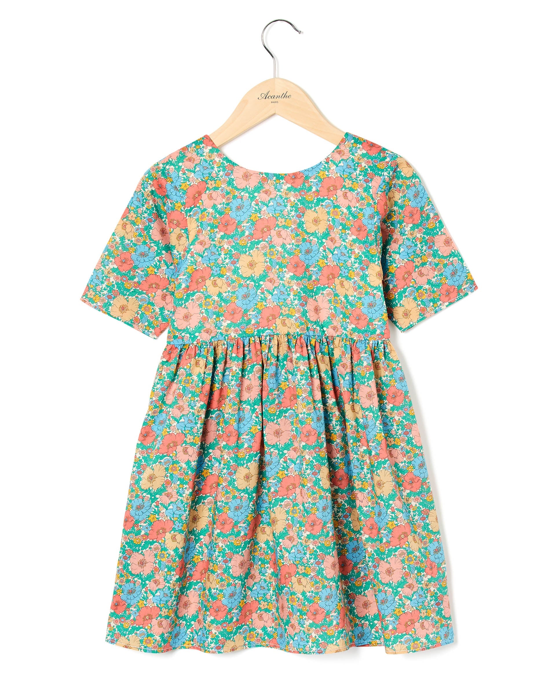 Encolure ronde devant et V au dos. Manche mi-longue. Boutonnage dos. Tissu Liberty pur coton.