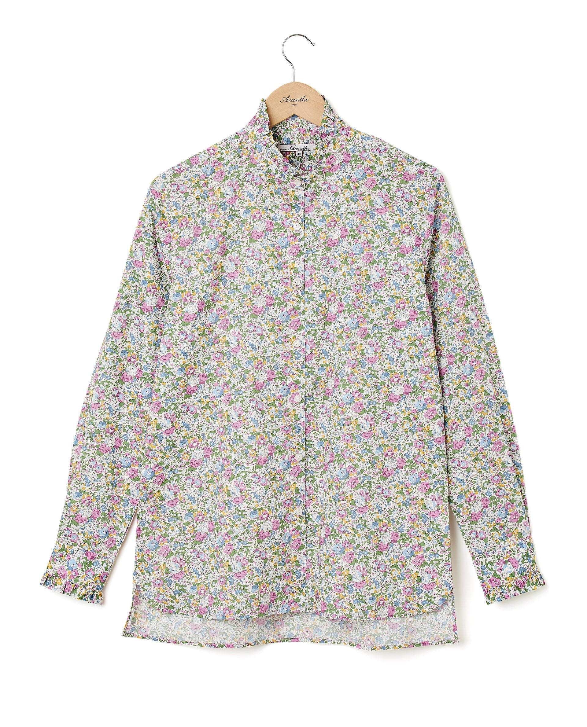 Chemisier manches longues avec petit volant au col et aux poignets, en tissu Liberty pur coton. Optez pour le tissu Liberty Claire Aude inspiré des années 30.