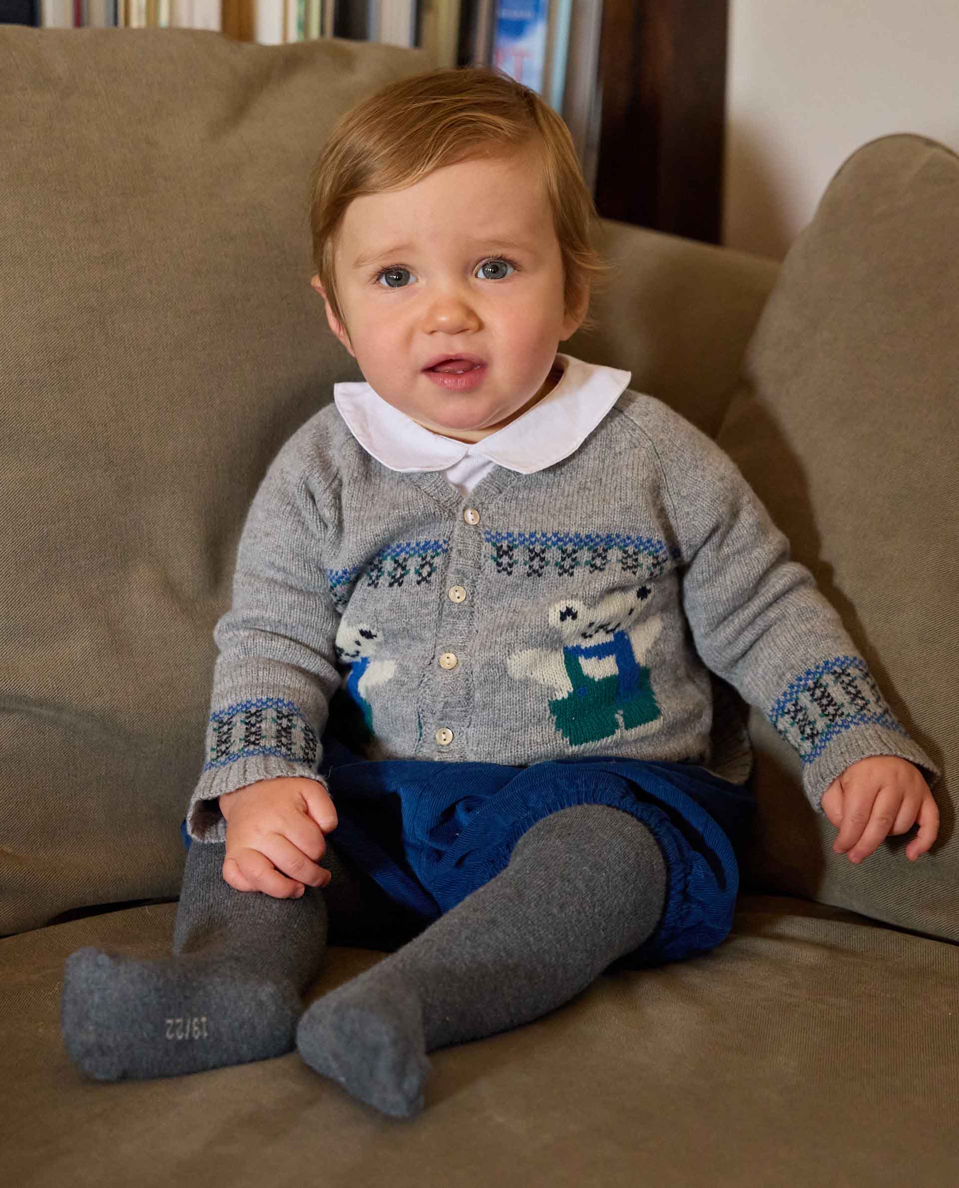 Cardigan jacquard. Fermé par des petits boutons nacre milieu devant. Finition bord-côtes. Pure laine d'agneau.