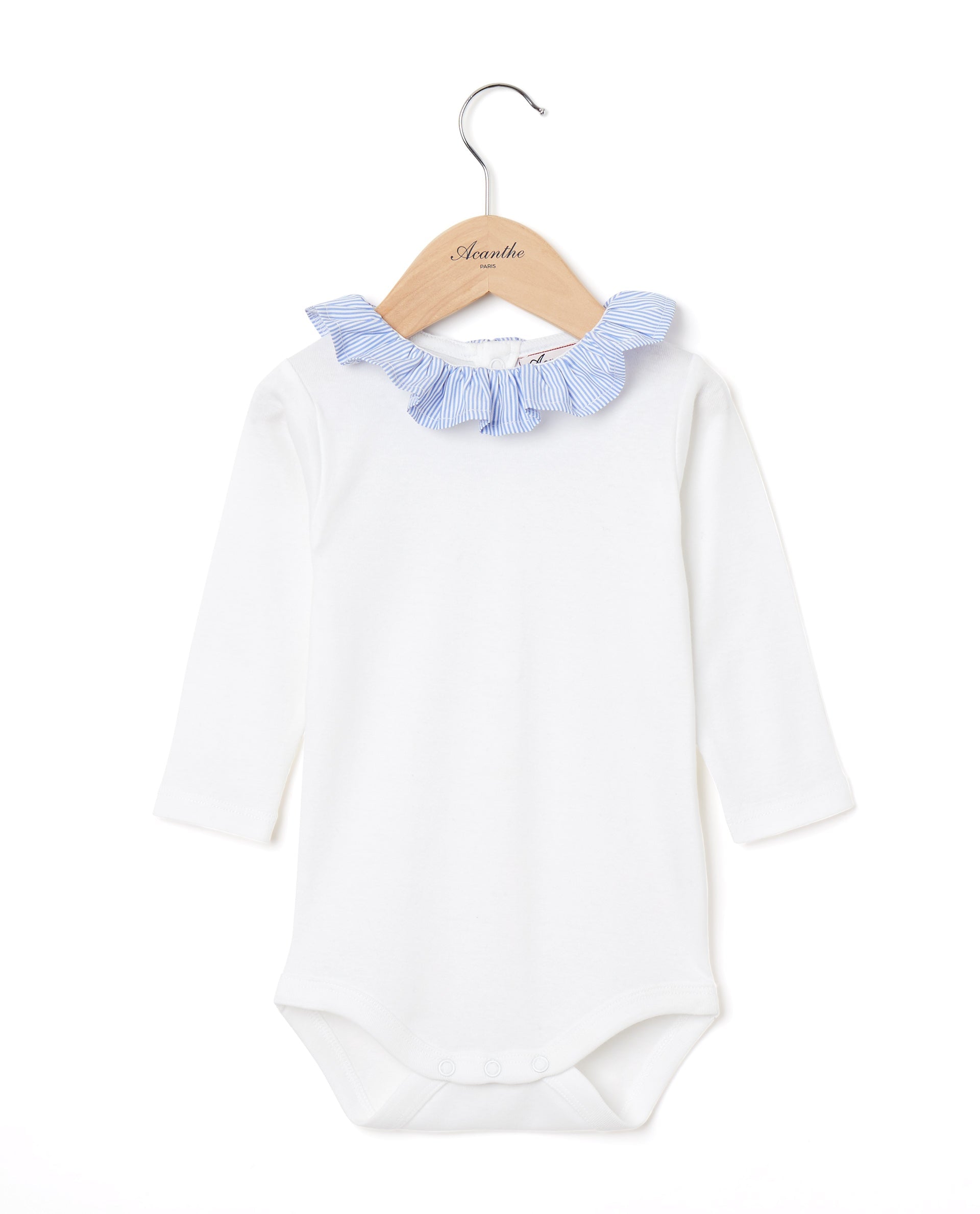 Body manches longues en pur coton. Patte boutonnée au dos. Entrejambe pressionné. Petit col volanté en popeline.