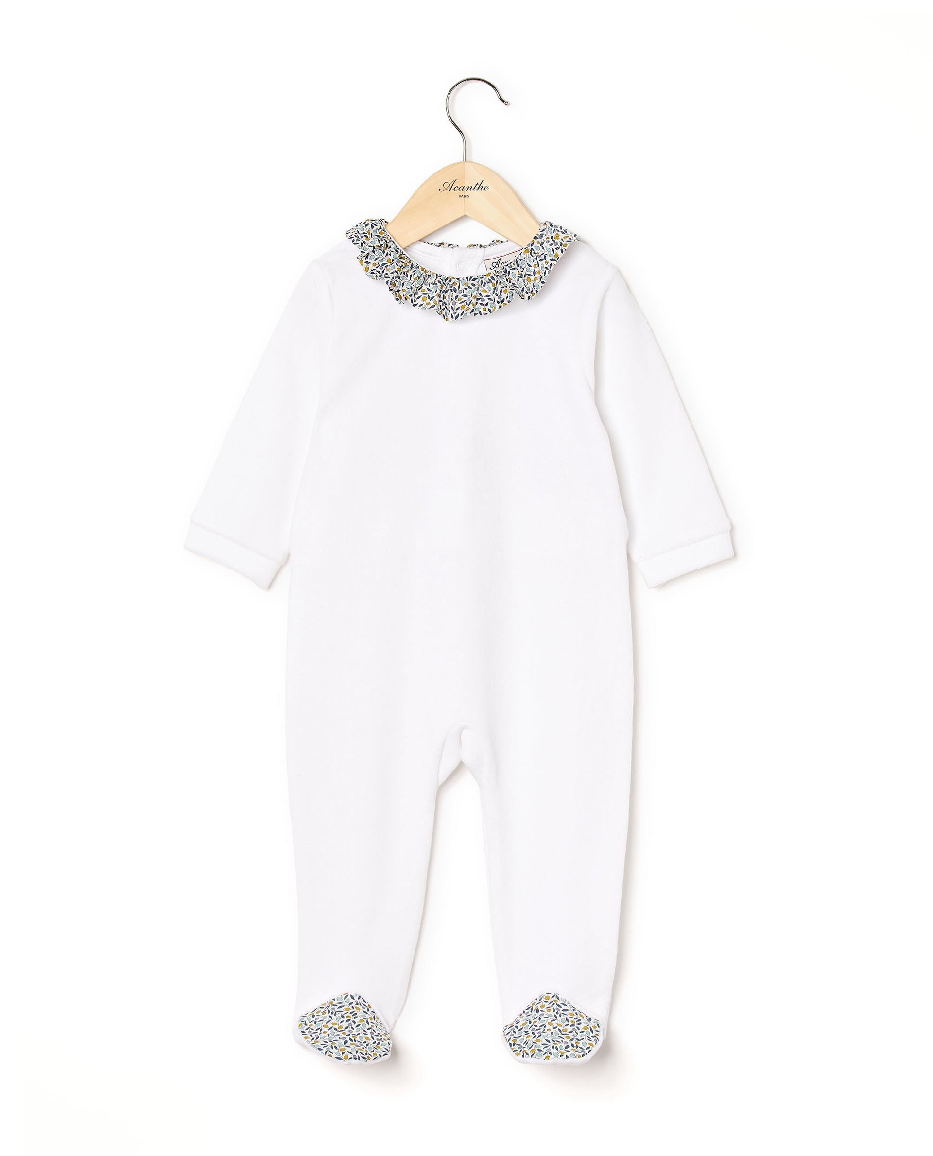 Pyjama bébé en velours éponge. Col volanté et dessus des pieds en tissu Liberty. Ouverture dos pont pressionné.