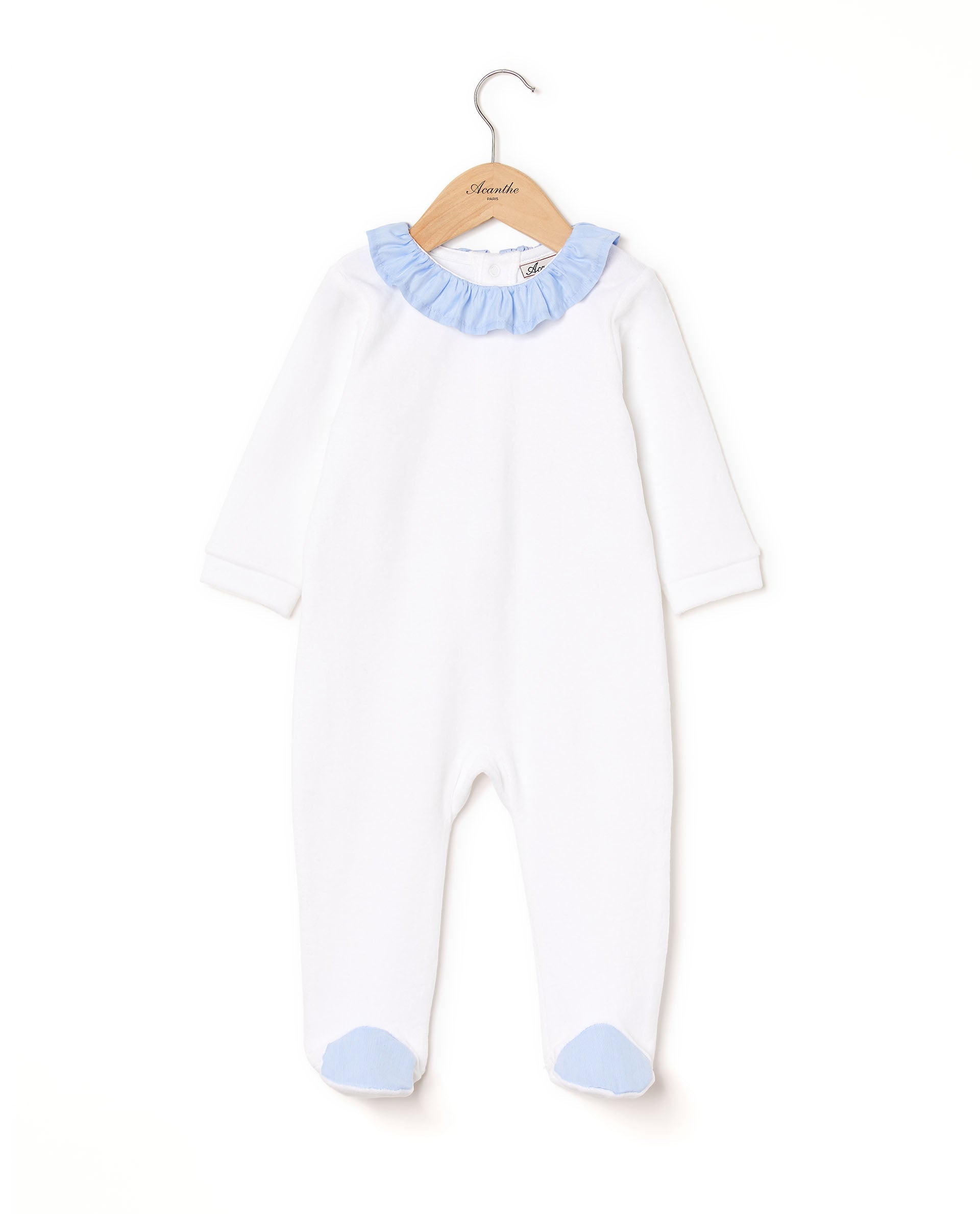 Pyjama bébé en velours éponge. Petit col volanté en popeline. Ouverture dos pont pressionné.