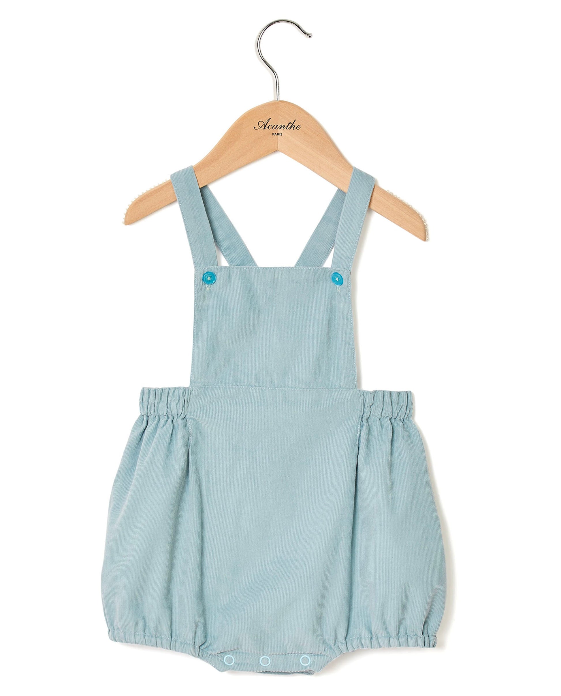 Culotte bouffante en velours. Bas de jambe élastiqué. Bretelles croisées au dos se boutonnant devant dans la bavette. Pur coton.