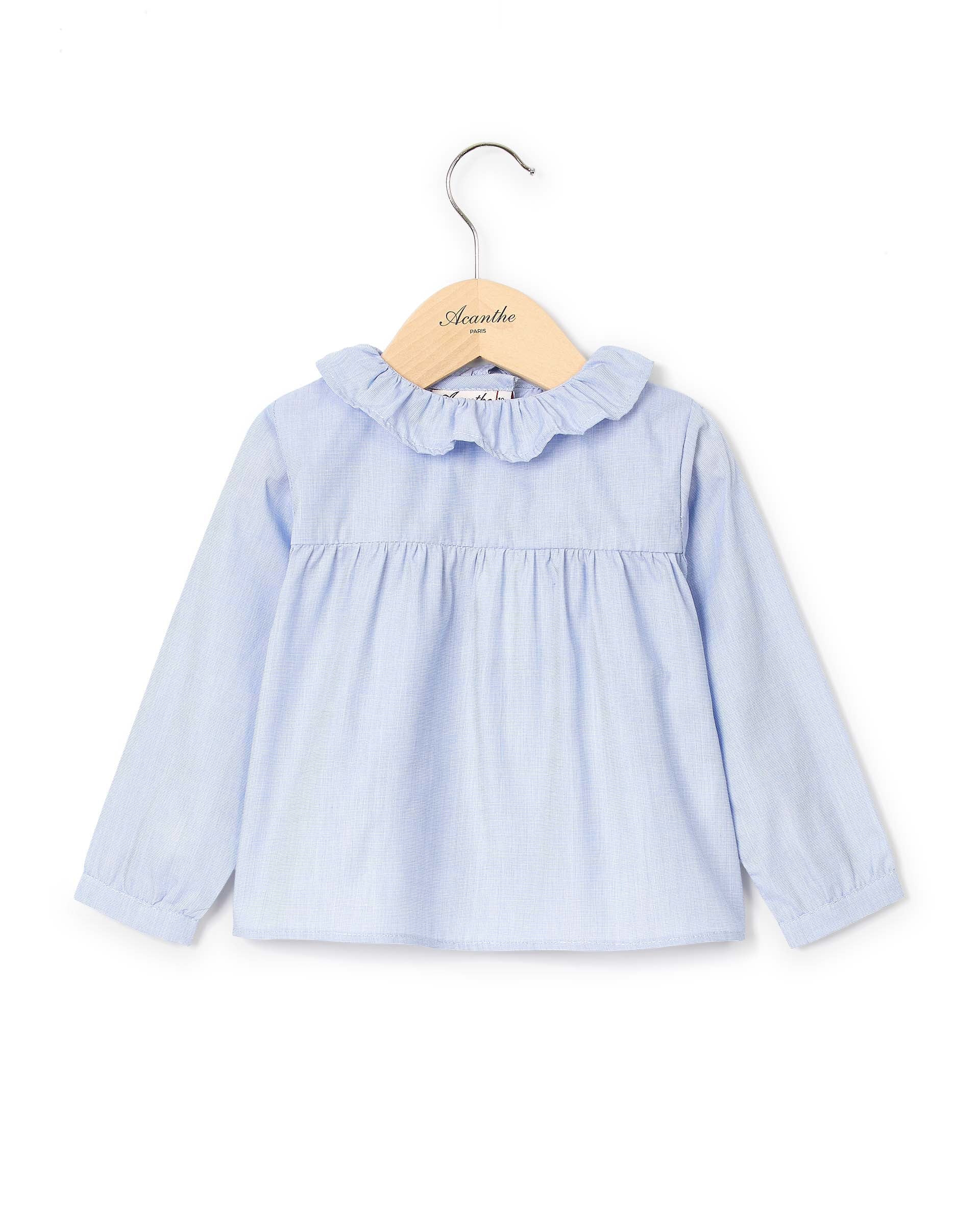 Blouse en popeline de coton. Manches longues resserrées par un bracelet boutonné. Boutonnage milieu dos. Col volanté.