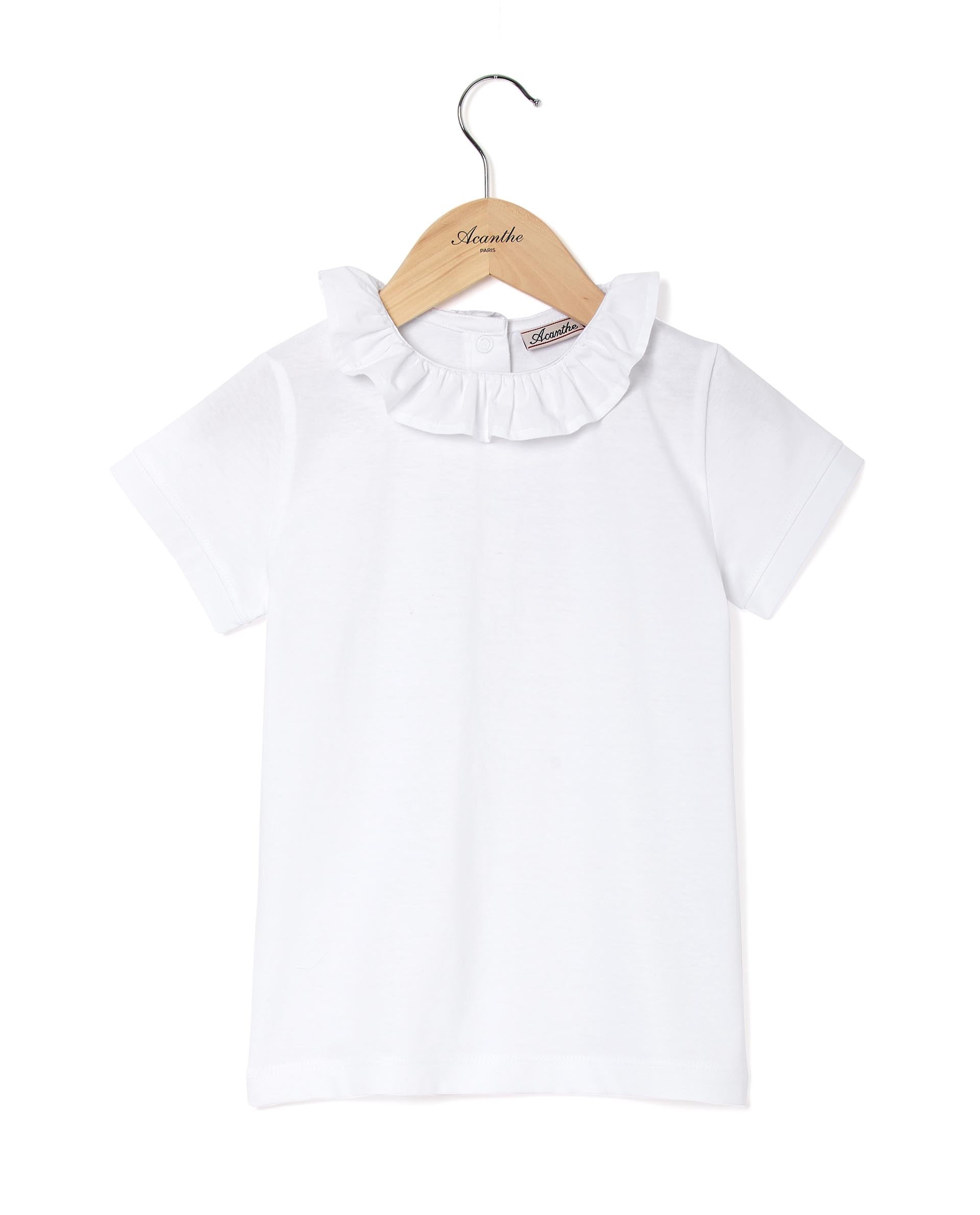 T-shirt avec col volanté en popeline blanche. Revers popeline au bas des manches. Boutonné au dos. Maille jersey coton. Le coton est une fibre végétale, hypoallergénique. C’est une matière avec un bon pouvoir absorbant et isolant : il supporte bien la chaleur.