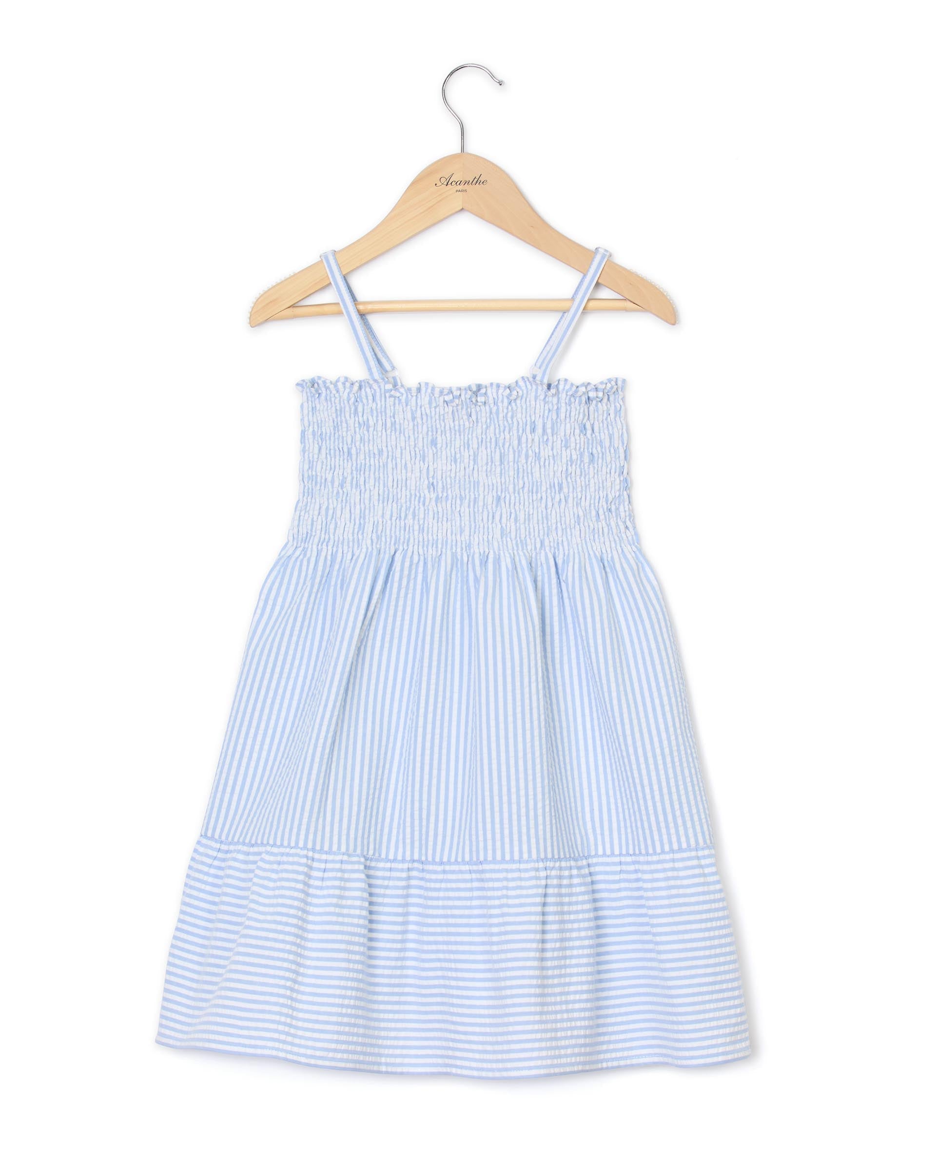 Robe smockée à bretelles seersucker ciel