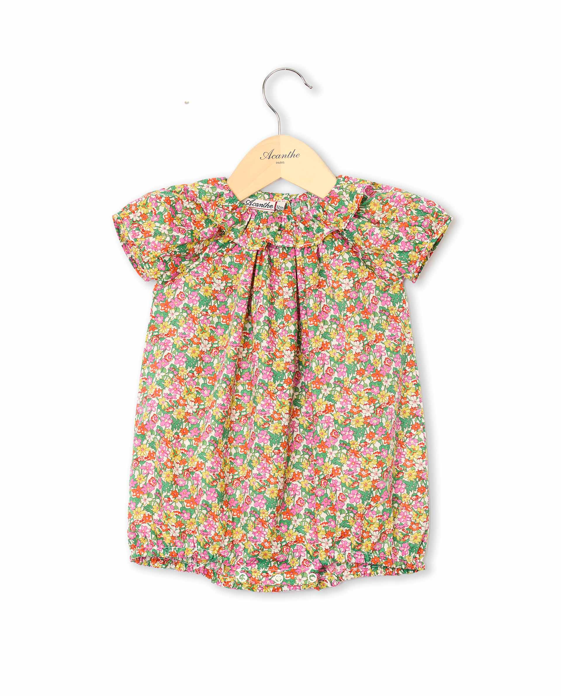 Manches ballon courtes. Col volanté. Fronces autour de l'encolure. Boutons pression à l'entrejambe. Tour de jambe élastiqué. Tissu Liberty pur coton.