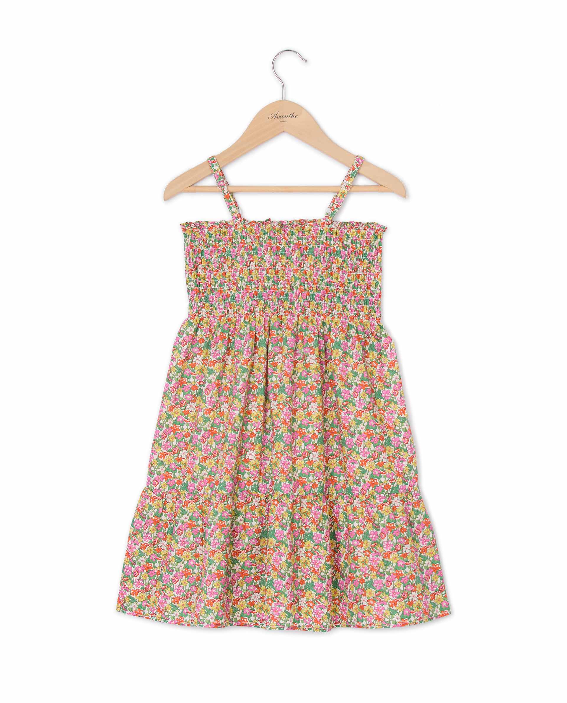 Buste élastiqué smocké. Bretelles réglables. Large volant au bas de la robe. Tissu Liberty pur coton.