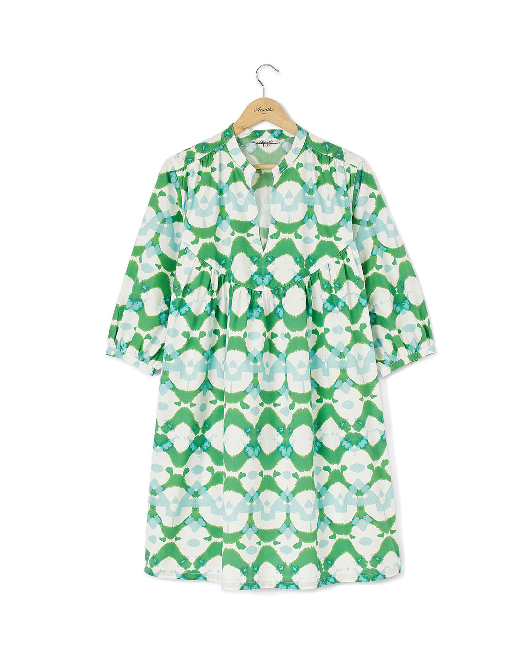 Robe ample manches bouffantes imprimé vert/bleu/blanc