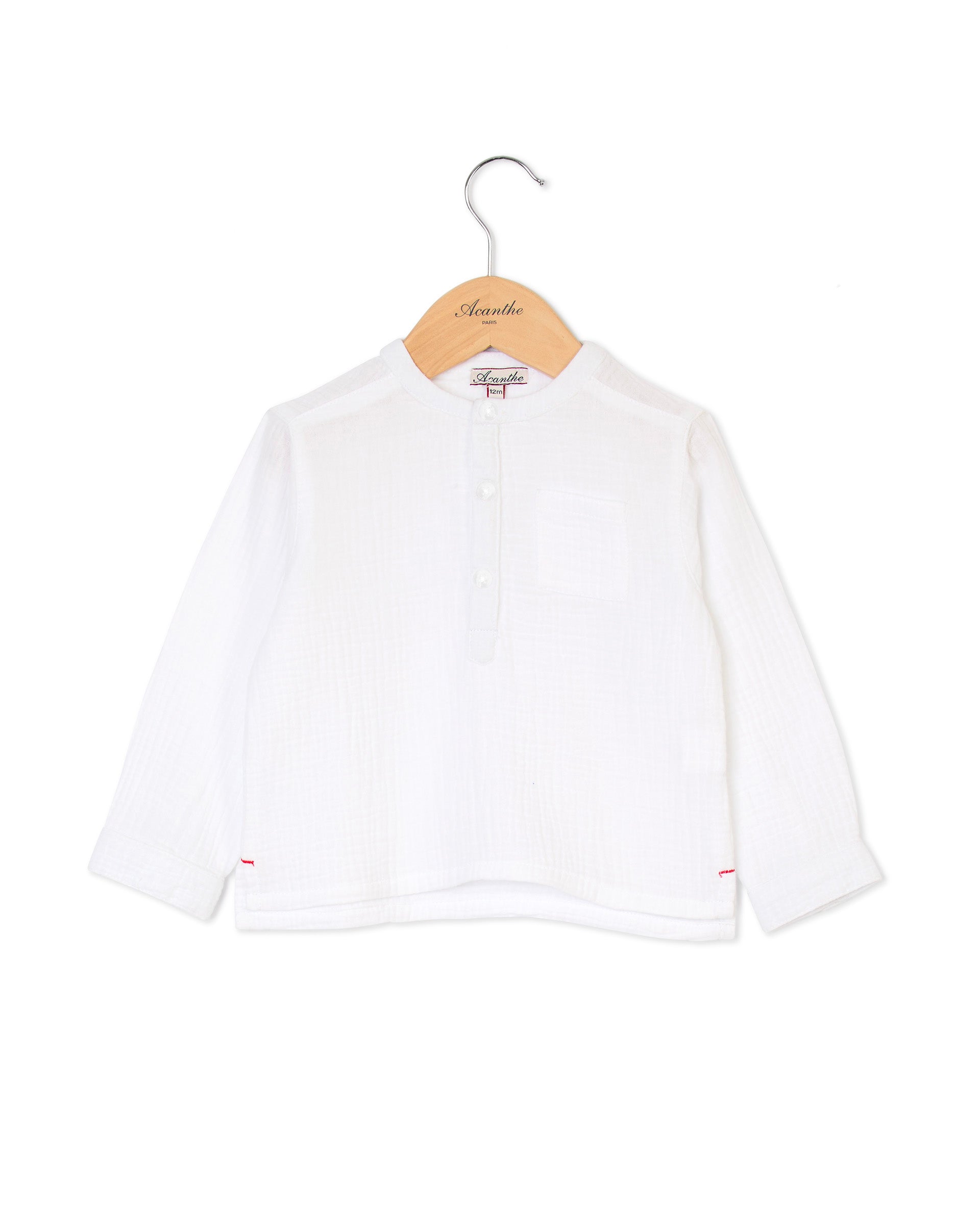 Double gaze de coton. Tunique encolure ronde, manches longues. Patte boutonnée milieu devant. On adopte la gaze de coton pour sa légèreté et son aspect légèrement gaufré.