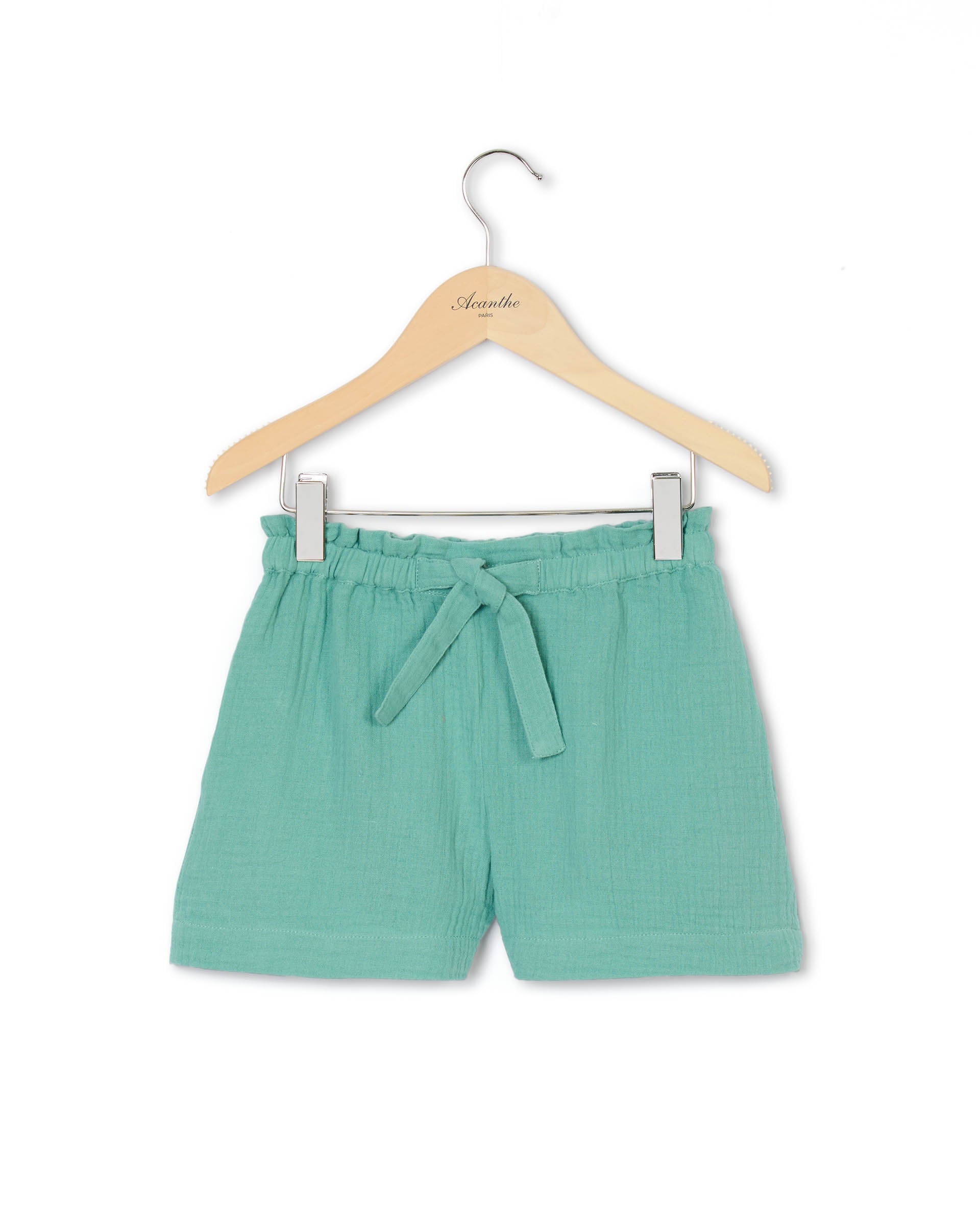 Double gaze de coton. Ceinture élastiquée tout autour. Deux pcohes côtés. Lien cousu à nouer devant.