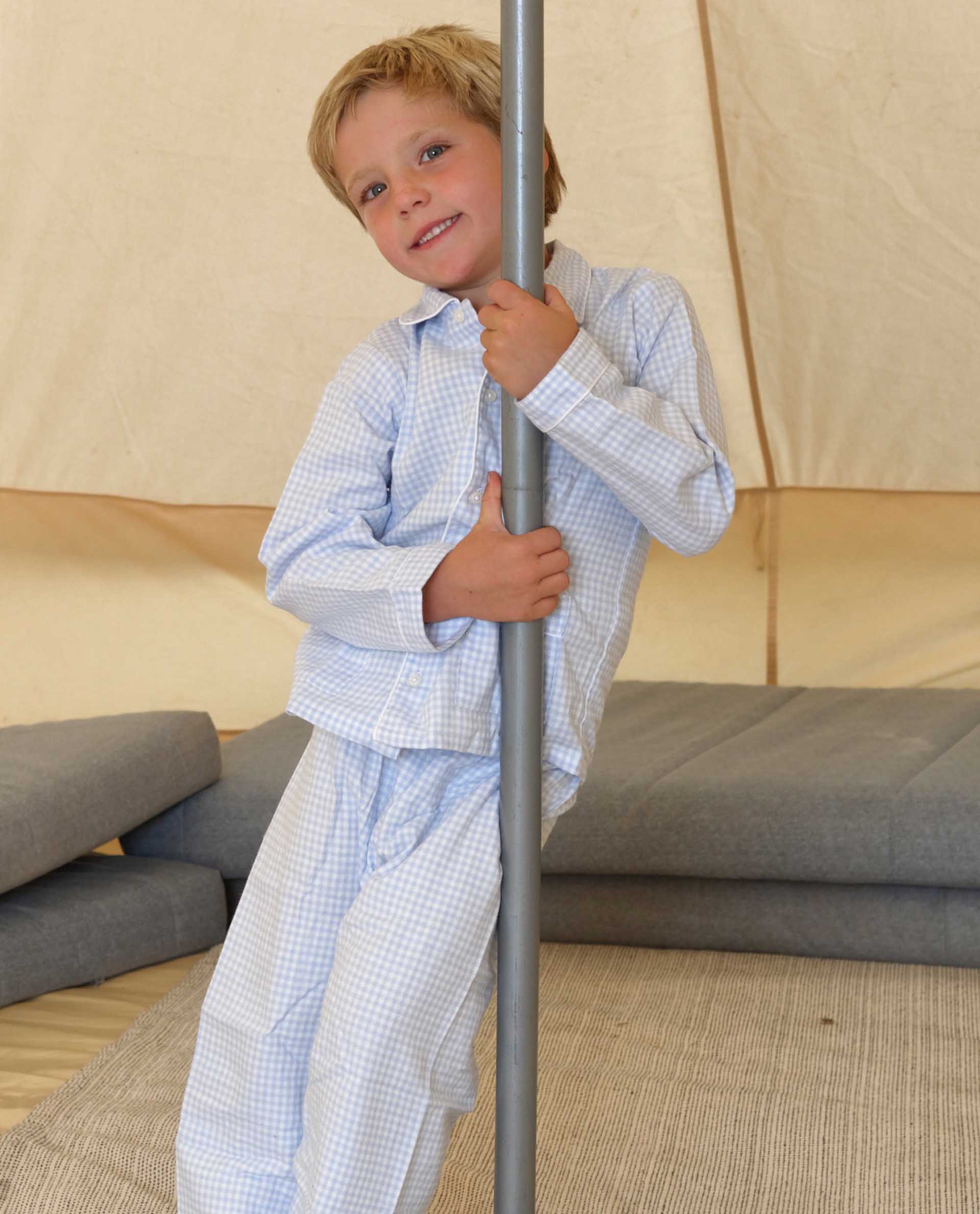 Pyjama garçon classique. Veste boutonnée devant, col pointu, manches longues et 2 poches plaquées. Bas à taille élastiquée. Finitions passepoil