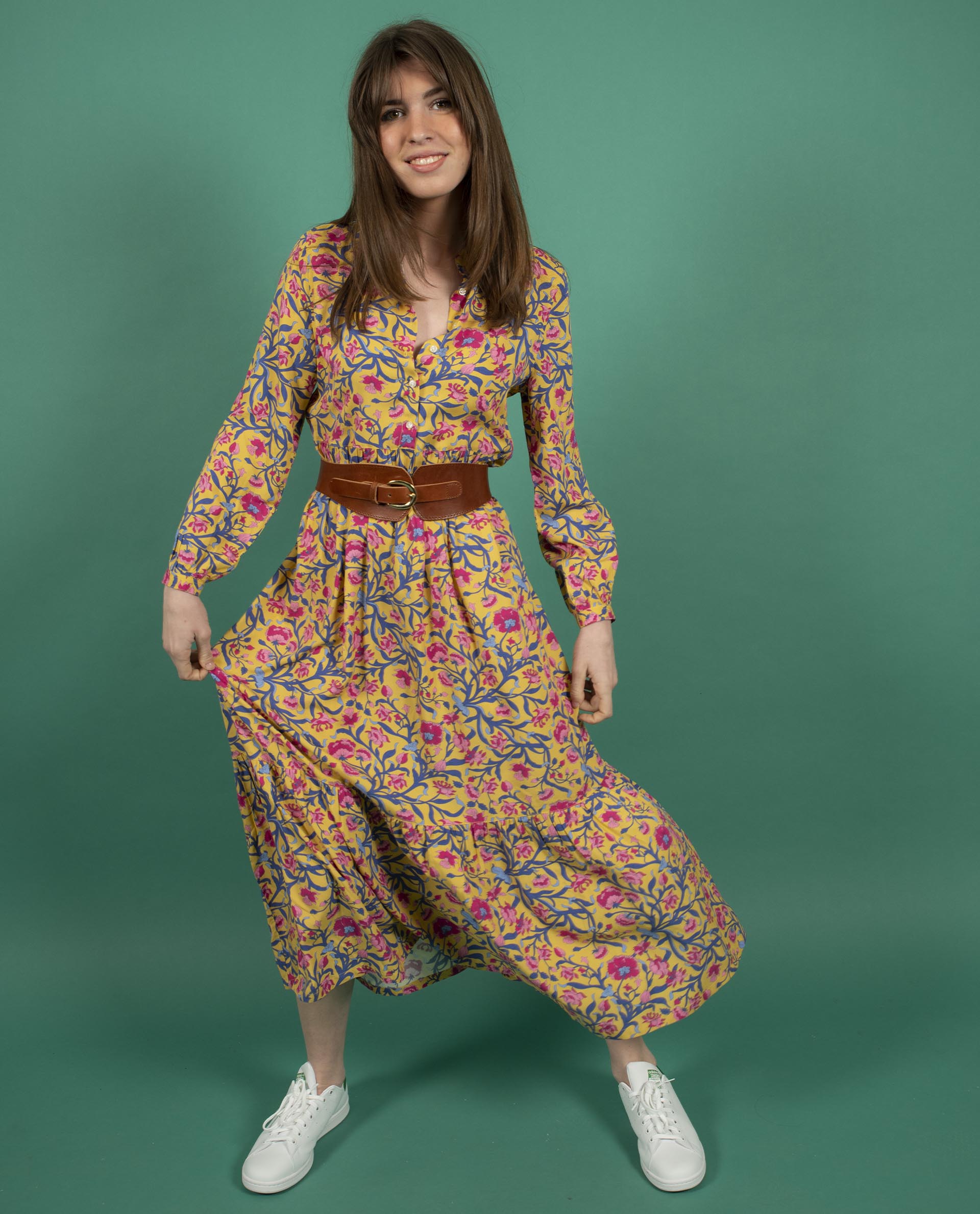 Robe longue, col mao. Manches longues. Grand volant au bas. Tissu Liberty 100% viscose.